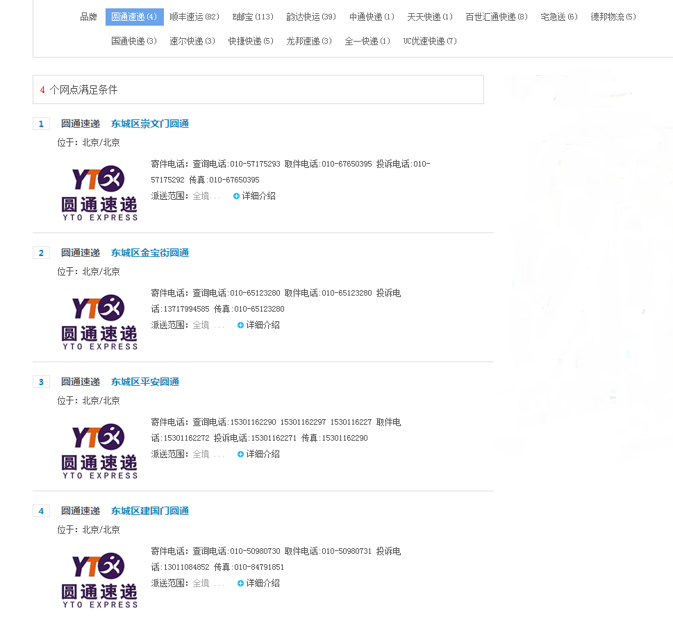 第三步:進入網(wǎng)點查詢,根據(jù)您喜好的快遞品牌選擇快遞網(wǎng)點。 直接電話聯(lián)系快遞網(wǎng)點進行溝通咨詢,如若收件時遇到問題件,也可在此找到投訴電話。