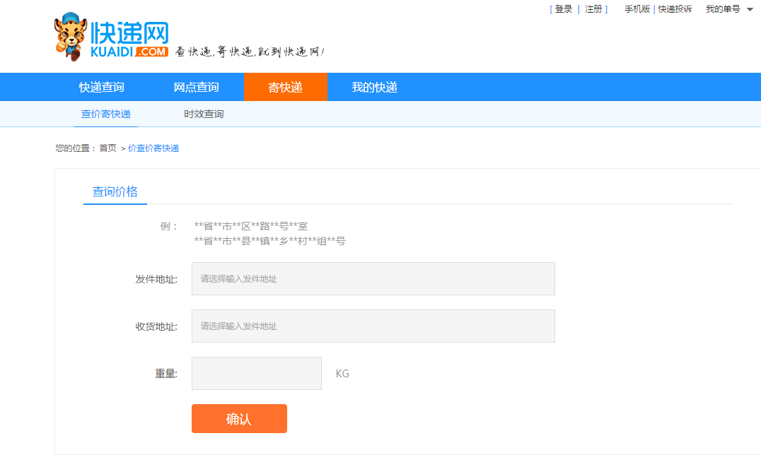 第一步:打開網(wǎng)站地址http://www.vdfgc.com/orderindex.html, 在“查價寄快遞”頁面輸入您的發(fā)件地、收件地以及重量,點擊“確認”。